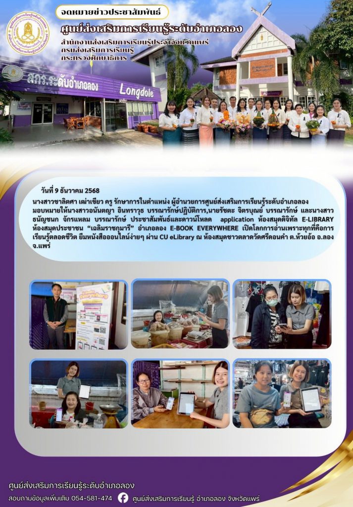 นางสาวชาลิตศา เฒ่าเขียว ครู รักษาการในตำแหน่ง ผอ.สกร.ระดับอำเภอลอง มอบหมายให้นางสาวอนันตญา อินทราวุธ บรรณารักษ์ปฏิบัติการ นายรัชตะ จิตรบุณย์ บรรณารักษ์ และนางสาวธนัญชนก จักรแหลม บรรณารักษ์ ประชาสัมพันธ์และดาวน์โหลด application ห้องสมุดดิจิทัล E-LIBRARY ห้องสมุดประชาชน “เฉลิมราชกุมารี” อำเภอลอง E-BOOK EVERYWHERE เปิดโลกการอ่านเพราะทุกที่คือการเรียนรู้ตลอดชีวิต ยืมหนังสือออนไลน์ง่ายๆ ผ่าน CU eLibrary ณ ห้องสมุดชาวตลาดวัดศรีดอนคำ ต.ห้วยอ้อ อ.ลอง จ.แพร่