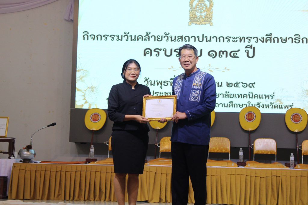 นางสาวอนันตญา อินทราวุธ บรรณารักษ์ปฏิบัติการ ห้องสมุดประชาขน “เฉลิมราชกุมารี” อำเภอลอง สกร.ระดับอำเภอลอง สังกัดสำนักงานส่งเสริมการเรียนรู้ประจำจังหวัดแพร่ เข้ารับรางวัล “ผู้ปฏิบัติงานดีเด่น หรือผู้ทำคุณประโยชน์ให้แก่กระทรวงศึกษาธิการ ประจำปี พ.ศ. ๒๕๖๙” เนื่องในโอกาสวันคล้ายวันสถาปนากระทรวงศึกษาธิการ ครบรอบ 134 ปี